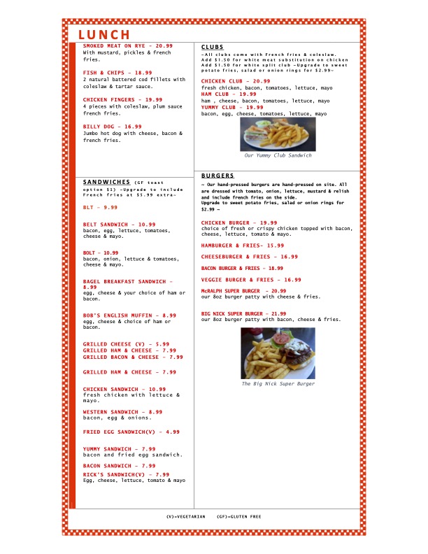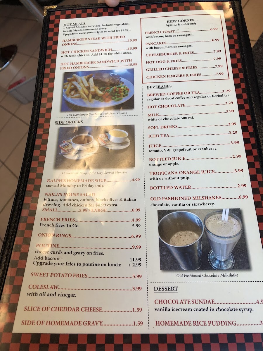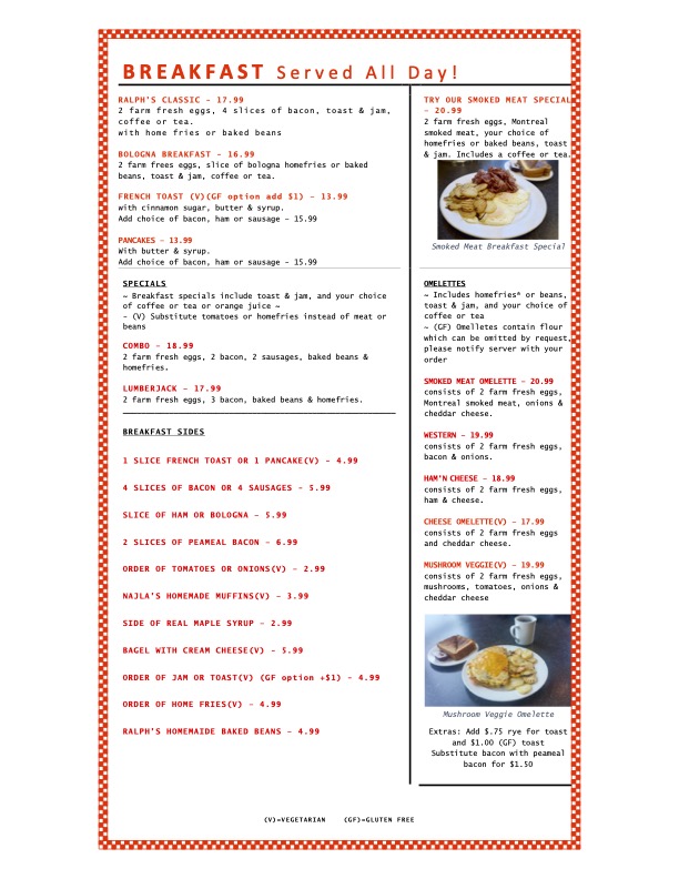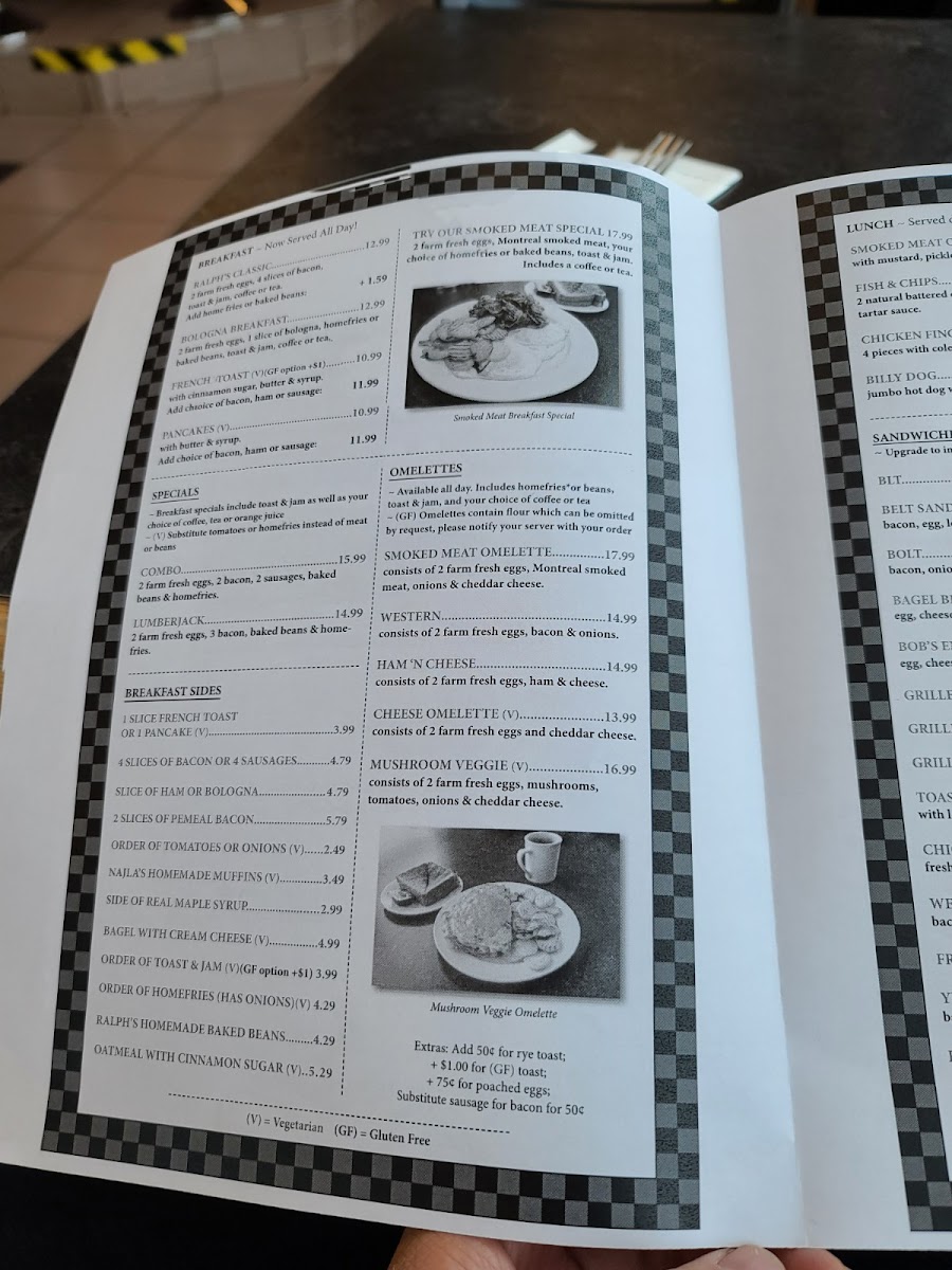 Ralph & Sons Diner prides itself on serving delicious, hearty meals that appeal to all ages. The extensive breakfast menu features standouts like the mouth-watering Ralph’s Classic Breakfast, loaded with fluffy eggs and crispy home fries. For those with a sweet tooth, their French Toast and Pancakes, both priced at CA$13.99, are ultimate treats that promise to tantalize your taste buds and leave you wanting more. Each breakfast is cooked to perfection, with generous portions that offer great value for your money.